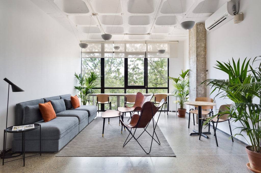 Este coworking con plurales sedes por el área metropolitana de Barcelona se instala en Hospitalet en un edificio de perfil industrial y de gran superficie. Bajo un diseño joven y fresco, donde la madera, los pilares de hormigón desnudos y el terrazo en el suelo son los protagonistas, se propone un mobiliario que acompañe las zonas de descanso aportándole calidez y diseño. Un mobiliario económico, pero con estilo, consiguen espacios de descanso para los trabajadores de múltiples empresas que ocuparán los despachos privados.