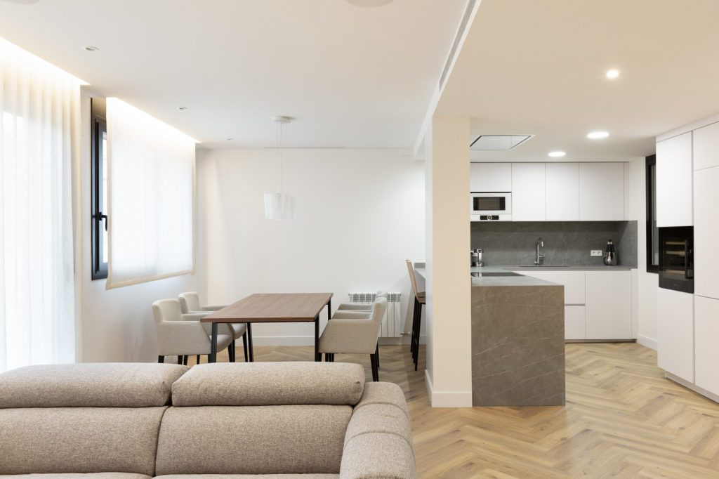 Te invitamos a descubrir la transformación de este piso, donde hemos realizado una reforma integral para crear un espacio que combina modernidad y confort. La unión del salón, comedor y cocina ha dado lugar a un ambiente amplio y luminoso, diseñado para adaptarse a la vida contemporánea del cliente.