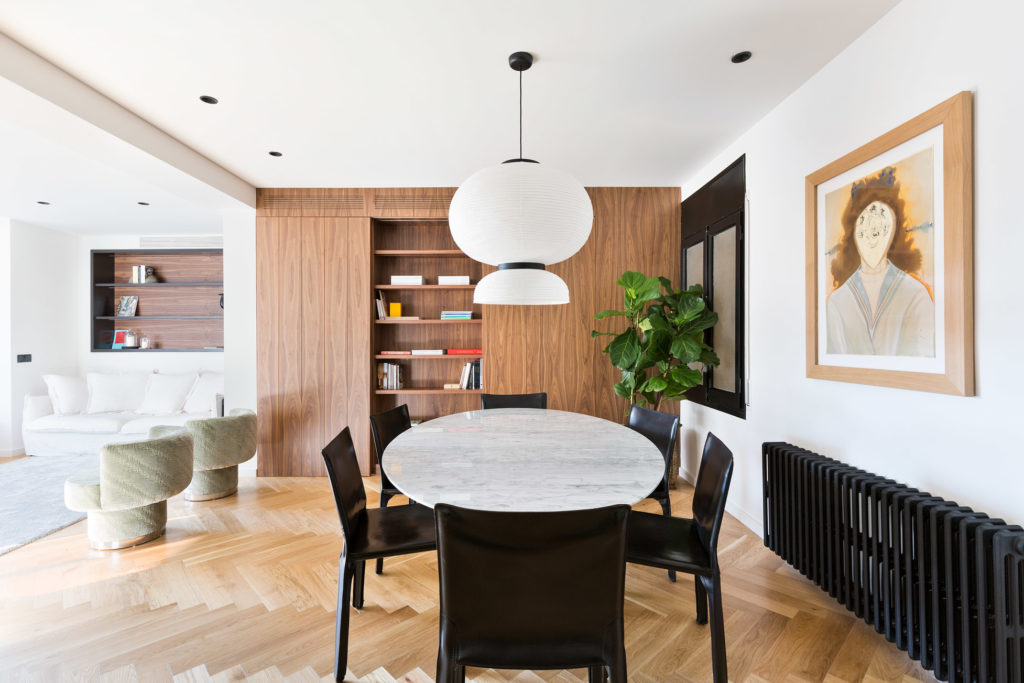 Cada detalle de esta reforma ha sido cuidado con mimo, utilizando materiales nobles que aportan una sensación de robustez y distinción. Los baños, revestidos de mármol, ofrecen un toque de lujo, mientras que el parquet natural y los muebles de nogal añaden calidez y sofisticación al ambiente.